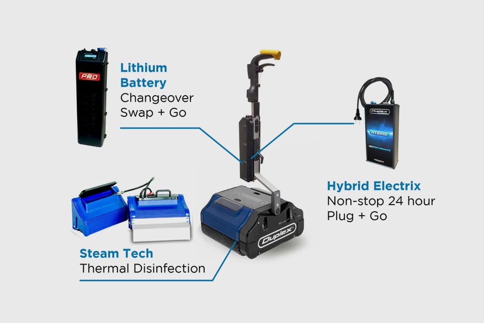Volitelné doplnění Hybrid Electrix umožňuje přeměnit Duplex Lithium Hybrid na Lithium Hybrid Steam pro čištění a dezinfekci podlahového povrchu, což zajistí ještě důkladnější úklid.